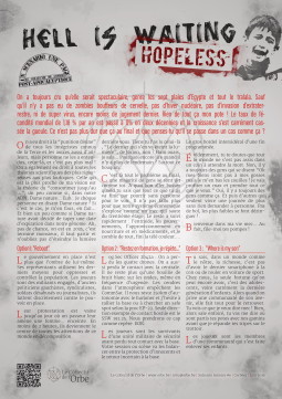 Connais-tu ? Hell is waiting hopeless Cerbère 14/06/2016 • Scénario une page Générique post-apocalyptique On a toujours cru qu’elle serait spectaculaire, genre les sept plaies d’Egypte et tout le tralala. Sauf qu’il n’y a pas eu de zombies bouffeurs de cervelle, pas d’hiver nucléaire, pas d’invasion d’extraterrestre, ni de super virus, encore moins de jugement dernier.